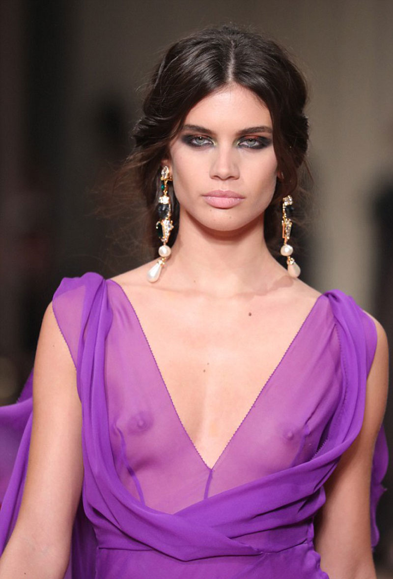 Sara Sampaio No Bra in Lacy Black Top on the Runway